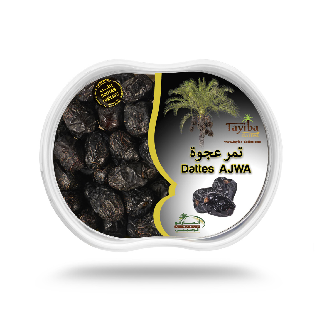 TAYIBA mempunyai keistimewaan untuk menawarkan anda kurma Ajwa dalam versi segar (“routab”) atau firm (“tamr”), dengan pilihan berkaliber sederhana atau besar. Yang terakhir terhasil daripada pilihan terpilih untuk menawarkan anda kualiti terbaik yang berkaliber besar. Apabila segar, kurma ini cair dan berkrim. Semasa mereka basah, kulit mereka berkedut dan merekah sedikit di bawah gigi. Versi firma sangat berkhasiat, ia kaya dengan serat dan menyediakan semua sumbangan yang diperlukan untuk memulakan hari dengan betul. Ia adalah makanan yang dikenali sebagai sekutu sempurna sarapan pagi.